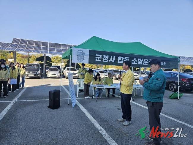 훈련에는 이정국 부군수를 비롯해 공직자 100여 명과 소방관 10명이 참여했으며, 청사 내 화재 발생을 가정한 실제 대응훈련이 이뤄졌다.
