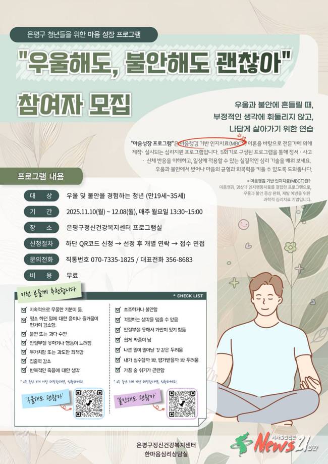 ▲ 사진=은평구청서울 은평구(구청장 김미경)는 청년들의 마음 성장 프로그램인 ‘우울해도, 불안해도 괜찮아’ 참여자를 모집한다고 밝혔다.