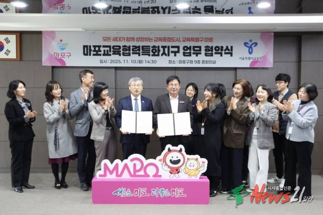 마포구청 중회의실에서 열린 이번 협약식은 마포구와 교육청의 협력 체계 구축과 운영 발전을 위한 업무 협약을 맺기 위해 열렸으며, 정근식 서울특별시교육청 교육감과 주윤숙 서울특별시서부교육지원청 교육지원국장 등이 함께했다.