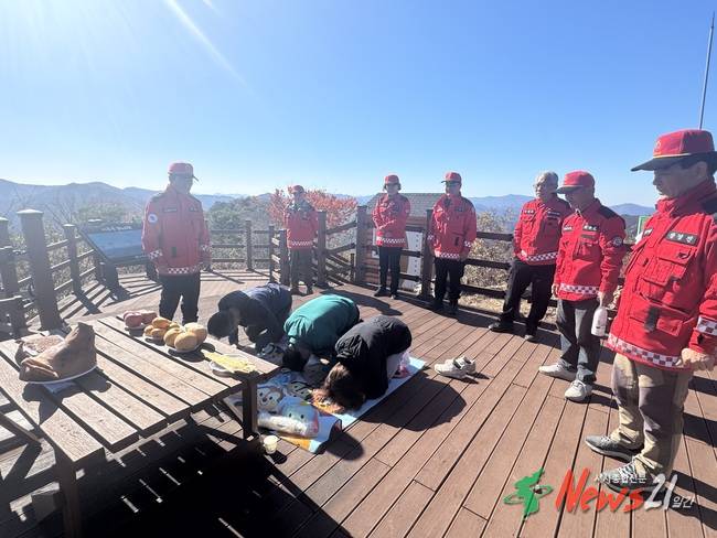 ▲ 사진=고성군고성군 대가면(면장 노석철)은 11월 10일, 대가면 시루봉 정상 산불초소에서 산불감시원과 면 직원 등 10여 명이 참여한 가운데 ‘산불방지 염원 기원제’를 실시했다.