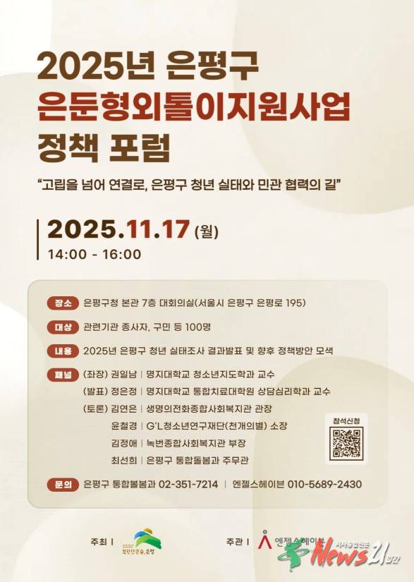 서울 은평구(구청장 김미경)는 외로움과 고립 위험에 취약한 청년층을 대상으로 민관이 협력할 방안을 모색하고자 오는 17일 ‘고립·은둔 정책포럼’을 추진한다고 밝혔다.