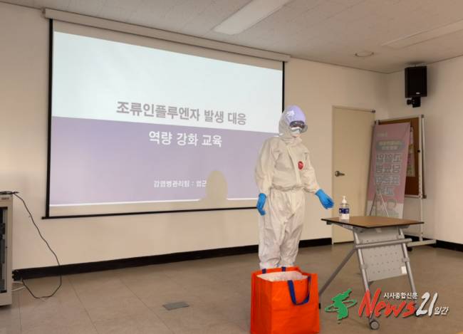 이번 훈련은 조류인플루엔자(AI) 발생 상황을 가정하여 ▲조류인플루엔자 발생 시 대응체계 ▲조류인플루엔자 인체감염 고위험군 관리조사서 작성 ▲개인보호구(Level D) 착‧탈의 시연 등을 중점적으로 진행했다.