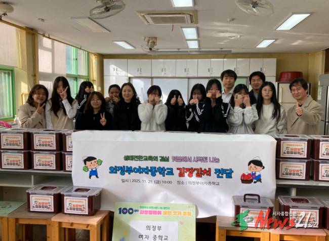 ▲ 사진=의정부시청의정부여자중학교(교장 김현주)는 11월 21일, 의정부시 가능동의 저소득 가구를 위해 직접 담근 김장김치를 기탁하며 지역사회에 따뜻한 온정을 전했다. 이번 행사는 학생들이 학교 텃밭에서 손수 기른 배추로 김치를 담가 이웃에게 전달한 것으로, 생태학습과 나눔의 가치를 결합한 의미 있는 활동이었다.