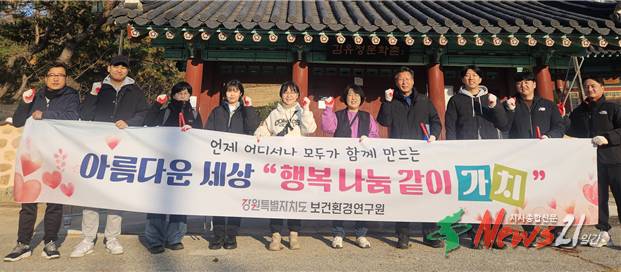 ▲ 사진=강원특별자치도□ 강원특별자치도보건환경연구원은 11월 22일 김유정문학촌 및 금병산 일대에서 건강과 환경을 지키는 ‘플로깅(plogging)’ 봉사활동을 실시했다. ‘플로깅(plogging)’은 조깅을 하며 쓰레기를 줍는 활동의 합성어로, 건강 증진과 환경보호를 동시에 실천할 수 있는 친환경 운동이다.