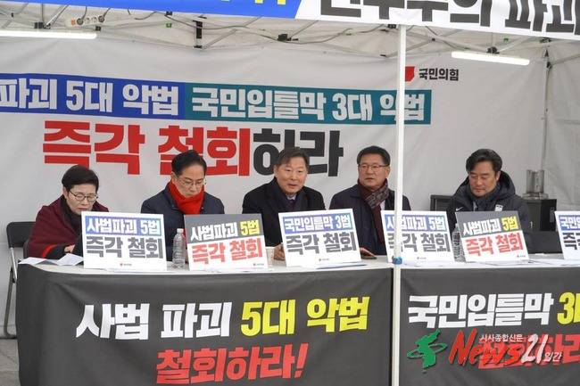 국민의힘은 더불어민주당이 추진하는 사법개혁·입법 과제를 ‘사법파괴 5대 악법’과 ‘국민 입틀막 3대 악법’으로 규정하고 반대하고 있다.