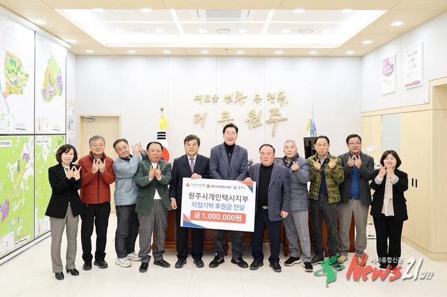 ▲ 사진=원주시 강원도개인택시운송사업조합 원주시지부(지부장 서철원)는 23일 원주시청을 방문해 지역 내 저소득층을 위한 후원금 100만 원을 전달했다.