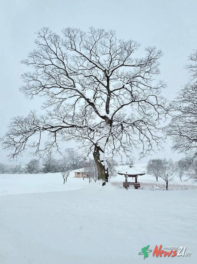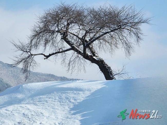 설경 속 고목나무는 겨울의 고요함과 시간의 깊이, 자연의 극한을 견디는 모습을 상징적으로 보여준다.