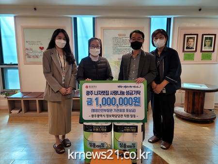 광주광역시는 행정안전부 주관으로 지난 9월29일 열린 ‘제38회 지역정보화 연구과제 발표대회’에서 우수기관으로 선정돼 행정안전부장관 표창과 함께 받은 포상금 100만원을 18일 광주나자렛집에 기부했다.