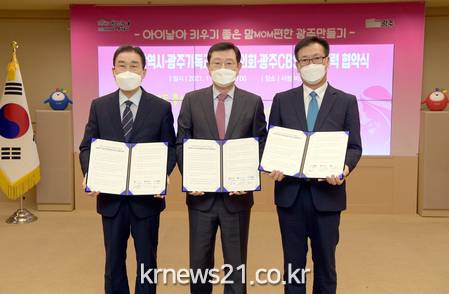 광주광역시는 9일 시청 비즈니스룸에서 이용섭 시장을 비롯해 광주광역시기독교교단협의회 강희욱 회장과 광주CBS 정용선 대표가 참석한 가운데 ‘아이낳아 키우기좋은 맘(MOM) 편한 광주만들기’ 실현을 위한 ‘지역사회 캠페인 확산 등 상호협력을 위한 업무협약’을 체결했다.