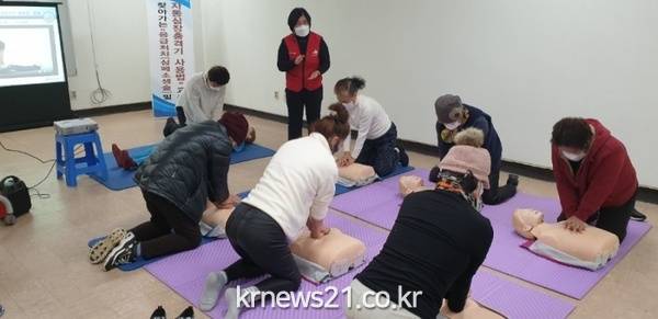 요청하여 2층 주민자치센터 회의실에서 응급처치 심폐소생술 및 자동심장충격기 사용법 교육을 실시하였다.