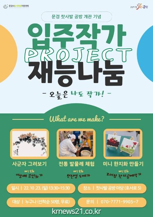 문경시와 도시재생지원센터(센터장 박정호)는 지난 10월 23일 문경 도시재생사업으로 조성하여 개관한 공예체험공간인 찻사발공방(호서로 5)에서 입주작가 재능 나눔 행사를 가졌다.