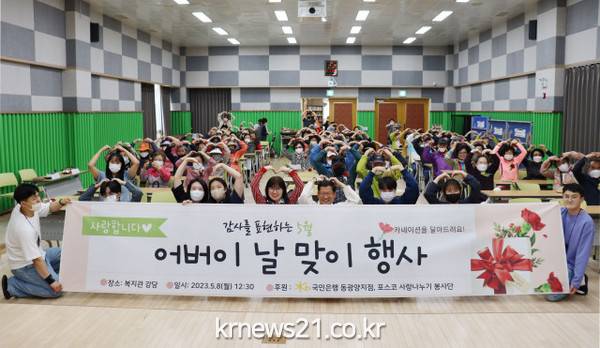 정헌주 광양시 중마장애인복지관 관장은 “따뜻한 마음을 전달해준 KB국민은행 동광양지점과 포스코사랑나누기 봉사단, SNNC 기록을 남기는 봉사단, 포스코 웃음꽃봉사단에 진심으로 감사하다”며 “덕분에 더불어 행복한 가정의달이 될 수 있었다”고 전했다.
