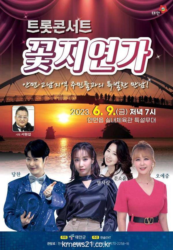 군은 6월 9일(금) 오후 7시 안면읍 실내체육관에서 트로트 가수들이 출연하는 ‘꽃지연가(戀歌)’ 공연이 열린다고 밝히고 지역 주민들의 많은 관심과 참여를 당부했다.