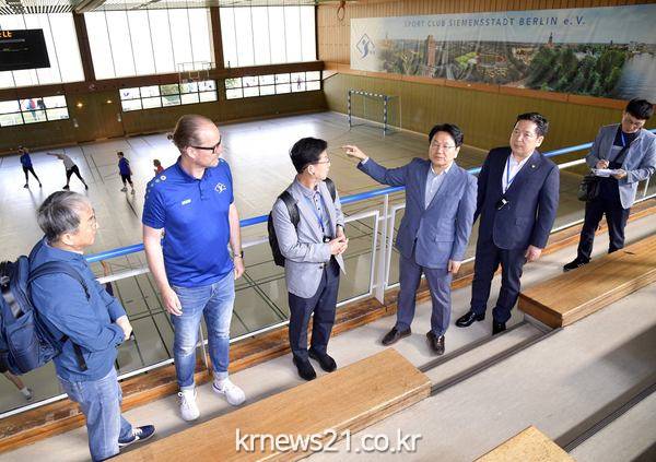 ▲ 사진=강기정 광주광역시장, 김병내 남구청장, 박병규 광산구청장 등 광주시대표단이 27일(현지시간) 오전 독일 베를린 최대 규모 생활스포츠클럽인 `지멘스슈타트`를 방문해 체육시설을 둘러보고 있다./광주광역시 제공