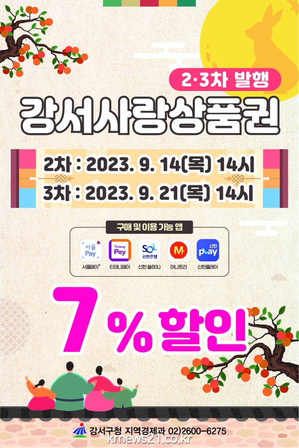 구 관계자는 “민족대명절 추석을 맞이해 소비자와 판매자 모두가 웃을 수 있도록 매년 인기리에 완판 행진을 이어가는 서울강서사랑상품권을 큰 규모로 추가 발행한다”라며 “소상공인 지원과 소비 촉진으로 지역 경제 활성화에 기여할 수 있도록 적극 노력하겠다”라고 말했다.