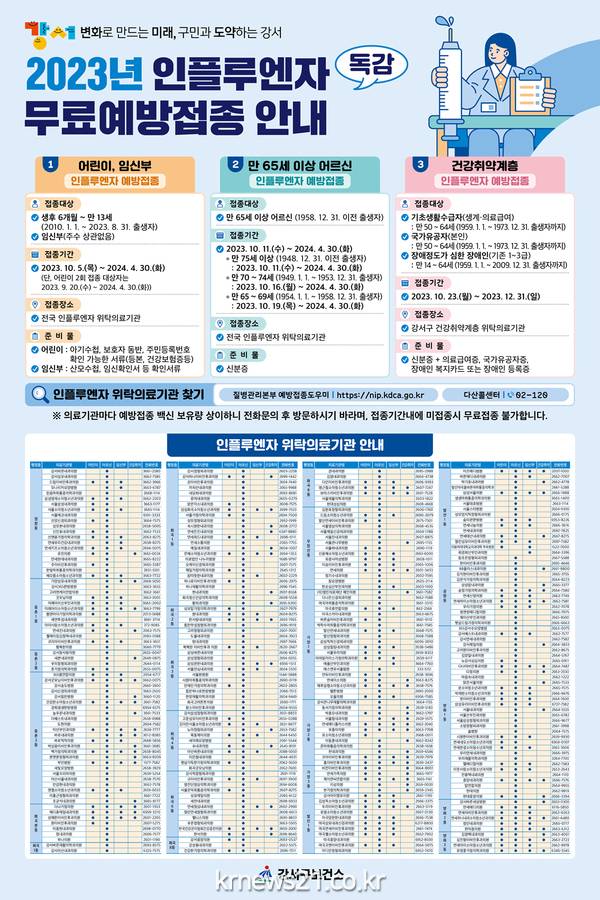 서울 강서구가 어린이, 임신부, 어르신, 건강 취약계층을 대상으로 독감 백신(인플루엔자 4가) 무료 예방접종을 시행한다.