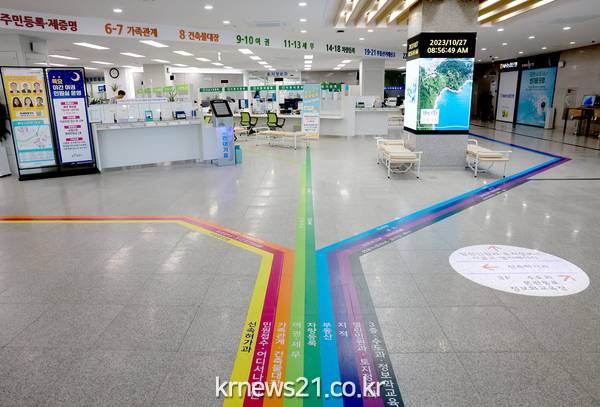 특히 처음 방문하는 민원인도 민원창구를 쉽게 찾아갈 수 있도록 민원실 입구부터 바닥 유도선을 설치하고 유도선과 민원창구 색상을 같게 적용하여 시인성을 높였다.