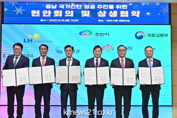 도는 18일 천안시청 대회의실에서 김태흠 지사와 원희룡 국토부 장관을 비롯해 박상돈 천안시장, 이용록 홍성군수, 이한준 한국토지주택공사(LH) 사장, 정석완 충남개발공사 사장 등이 참석한 가운데, 현안회의 및 상생협약식을 개최했다.