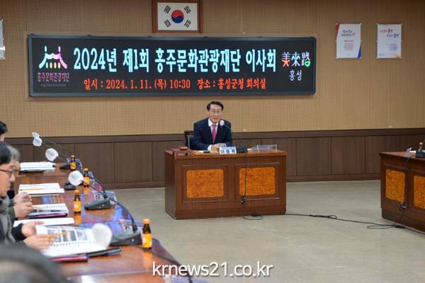 (재)홍주문화관광재단(이사장 이용록)이 11일 군청 회의실에서 2024년 제1회 이사회를 개최했다. 이번 이사회는 이용록 홍성군수와 최건환 대표이사를 비롯해 당연직 및 선임직 이사 10명 전원이 참석했다. (재)홍주문화관광재단은 이날 이사회에서 ▲2023년 사업결과보고 ▲2023년 예산 세입?세출결과보고 ▲2024년 사업계획안 ▲2024년 본예산안 ▲(재)홍주문화관광재단 규정 개정안 ▲임원추천위원회 위원 추천을 심의하여 각 현안에 대한 다양한 의견 개진과 토론이 이루어졌고 안건은 원안 가결 및 부분 가결됐다. 이어 2024년도 주요 사업 발전방향에 관해 최상열 사무국장은 ”지역과 상생하는 문화관광재단이 되기 위해 최선의 노력을 다할 것이며, 특히 홍성군 대표축제인 글로벌바베큐페스티벌은 재단 모두가 원팀이 되어 행사 준비에 만반을 다하겠다.“고 말했다. 이용록 홍성군수는 “홍주문화관광재단을 설립한 지 만 3년이라는 시간이 경과하며 군민들의 기대와 동시에 대?내외의 평가가 이루어지는 시기에 접어들었다.”라며 “지역 문화관광산업 전반을 아우르기 위해 내부적 혁신과 긴밀한 협업체계를 구축하여 홍성의 문화예술 정책과 창작, 관광, 축제 전반에 시너지 효과가 이루어질 수 있도록 노력해 줄 것”을 당부했다.