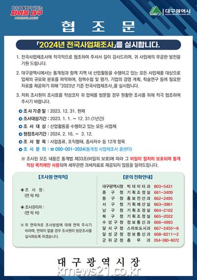 대구광역시는 2월 16일(금)부터 3월 12일(화)까지 조사기준일(’23.12.31.) 또는 조사일 현재 지역 내에서 산업활동을 수행하고 있는 모든 사업체를 대상으로 사업체조사를 실시한다.