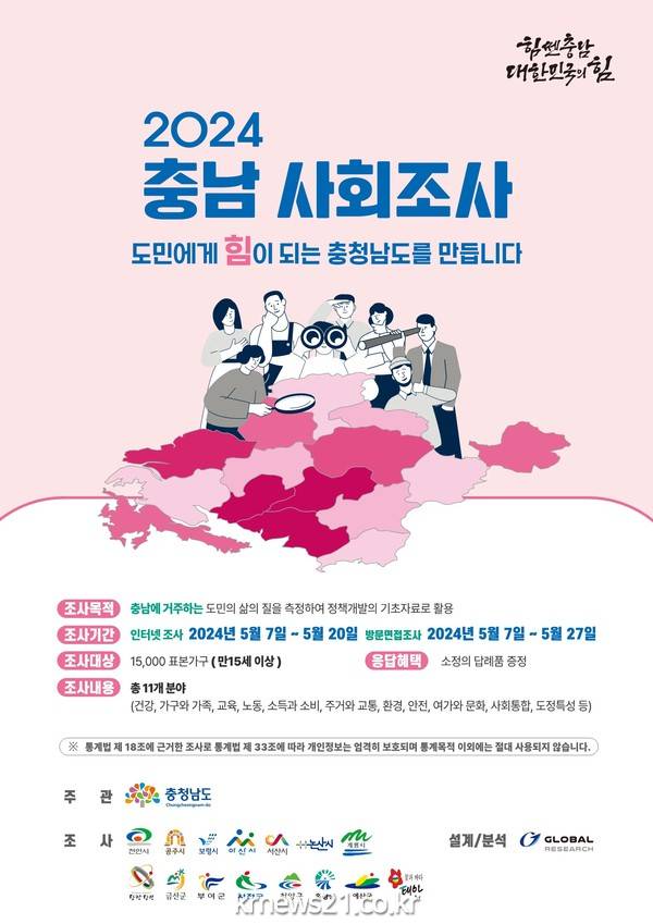 인터넷 조사는 5월 7일부터 5월 20일까지 충청남도 사회조사 홈페이지(https://www.narastat.kr)에서 참여 가능하다.