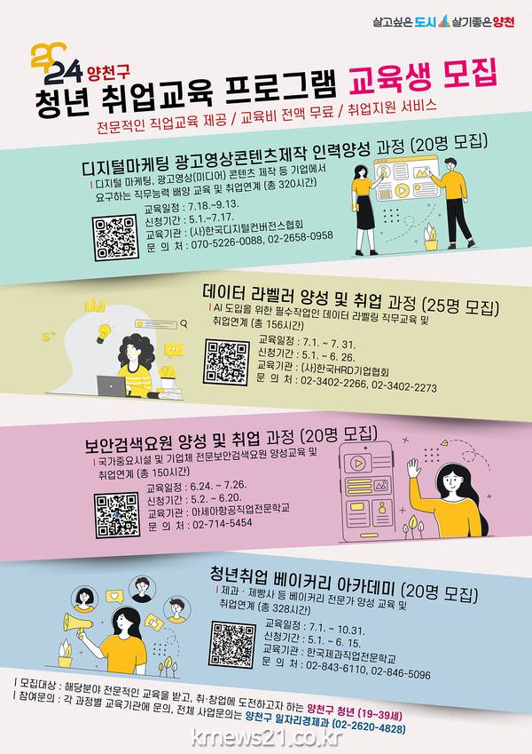 양천구(구청장 이기재)는 지역청년들의 취업역량 강화를 위해 인터넷 미디어, 첨단과학, 안전환경 등 4개 분야에서 전문 교육기관과 연계한 취업 교육 프로그램을 운영하고 이달부터 대상자 85명을 모집한다고 8일 밝혔다. 앞서 구는 청년들이 실질적으로 원하는 취업 교육 프로그램을 운영하고자 올해 직업교육과정은 지난해 지역청년 372명을 대상으로 실시한 6개 분야 35개 직업교육과정에 대한 수요조사결과를 반영해 선정했다. 교육은 총 4가지 분야로 ▲데이터 라벨러 양성 및 취업 과정 ▲디지털마케팅 광고영상콘텐츠 제작인력 양성과정 ▲보안검색요원 양성 및 취업 과정 ▲청년취업베이커리 아카데미 등이다. 구는 대상자에게 분야별 양질의 무료강의를 제공하고, 향후 관련분야 취업기관과 취업연계 등 사후관리를 통해 취업경쟁률을 높일 방침이다.첨단과학기술분야 교육인 ‘데이터 라벨러 양성 및 취업과정’은 (사)한국HRD기업협회에서 25명의 수강생을 대상으로 AI 도입을 위한 필수작업인 데이터 라벨링 직무교육과 실습프로젝트 등 총 156시간의 교육을 제공한다. 인터넷·미디어·문화예술분야인 ‘디지털마케팅 광고영상콘텐츠 제작인력 양성과정’은 디지털콘텐츠 크리에이터, 미디어 분야 취·창업을 희망하는 청년에게 적합한 교육이다. (사)한국디지털컨버전스협회에서 영상미디어 콘텐츠 제작, 기업연계 프로젝트 등 총 320시간의 교육을 제공하며 모집인원은 20명이다. 안전분야인 ‘보안검색요원 양성 및 취업과정’은 국가중요시설 및 기업체에서 요구하는 전문보안검색요원을 양성하는 교육으로 수강생은 아세아항공직업전문학교에서 보안검색 실무 등 150시간의 교육을 받게 된다.