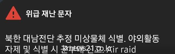 이번 재난문자는 합동참모본부가 경기와 강원 접경지역 일대에서 대남 전단 추정 미상 물체를 식별해 보내진 조치로 일부 물체는 떨어진 것으로 알려졌다.