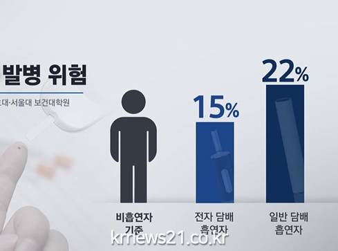 가톨릭대와 서울대 공동연구팀이 성인 46만 명을 분석한 결과 비흡연자보다 전자담배 흡연자는 15%, 일반담배 흡연자는 22% 정도 당뇨병 위험이 더 높았다.