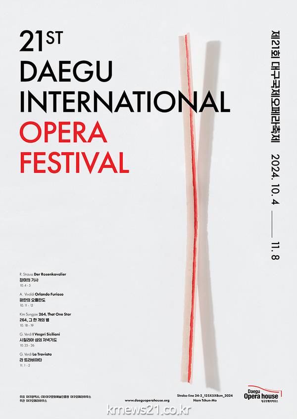 제21회 대구국제오페라축제의 개막작은 혁명적인 오페라 작곡가 슈트라우스의 최대 흥행작이자, 중세 오스트리아의 마리아 테레지에 여왕 시대를 중심으로 한 로맨틱 코미디 오페라 〈장미의 기사 Der Rosenkavalier〉다. 대구 초연으로 선보이게 되는 〈장미의 기사〉는 슈트라우스가 자신의 장례식에서 불러달라는 유언을 남겼을 정도로 사랑했던 작품으로, 아름답고 황홀한 음악으로 가득하다. 두 번째 주에 이어지는 작품은 이탈리아 페라라 시립오페라극장으로부터 초청한 비발디의 〈광란의 오를란도 Orlando Furioso〉(**한국 초연)다. 한국-이탈리아 수교 140주년을 기념하여 상호 초청으로 진행되는 공연으로, 2025년 2월에는 대구오페라하우스의 〈안드레아 셰니에〉 프로덕션을 이탈리아 페라라 시립오페라극장 무대에서 공연할 예정에 있다.