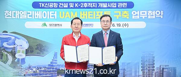 대구광역시는 6월 19일(수) 오전 11시 대구시청 산격청사에서 현대엘리베이터㈜(대표 조재천)와 ‘K-2후적지 및 TK신공항 등 주요거점 연계 도심항공교통(UAM) 버티포트 구축’을 위한 업무협약을 체결했다.
