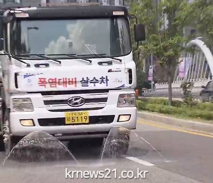 뜨겁게 달아오른 도로에 살수차가 연신 시원한 물을 뿌리며 지나간다.