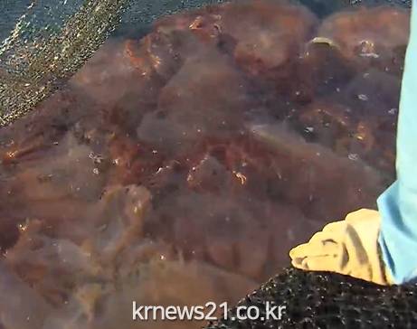 최대 200㎏까지 자라는 해파리가 그물에 들어차, 제대로 끌어올릴 수도 없다.