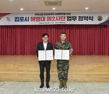 김포시와 해병대 제2사단은 지난 8.29.(목) 김포시청 대회의실에서 김포시장(김병수)과 해병대 제2사단장(해병 소장 정종범) 등 관계자들이 참석한 가운데 관·군 상생발전을 위한 협약(MOU)을 체결했다.