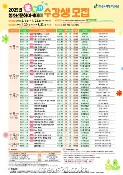 신청은 신규 및 기존회원 구분없이 김포시청소년재단 온라인 수강신청(www.fgy.or.kr/edu)을 통해 할 수 있다. 더 자세한 사항은 김포시청소년재단 중봉청소년수련관(031-980-1651)으로 문의하면 된다.