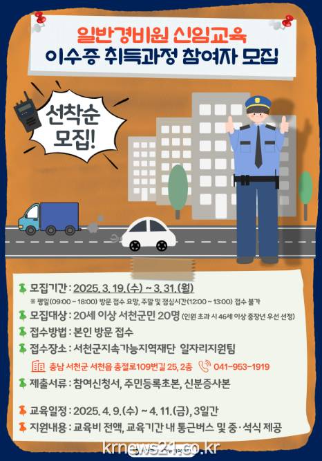 (재)서천군지속가능지역재단(이사장 김기웅, 이하 재단)은 오는 3월 31일까지 일반경비원 신임교육 과정 참여자를 모집한다고 밝혔다.