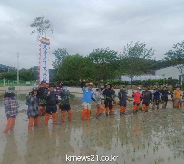 김기웅 서천군수가 지난 23일 서천군농업기술센터 내 벼 품종 비교전시포에서 직원 40여명과 함께 손 모내기를 진행하며 현장 행보에 나섰다.