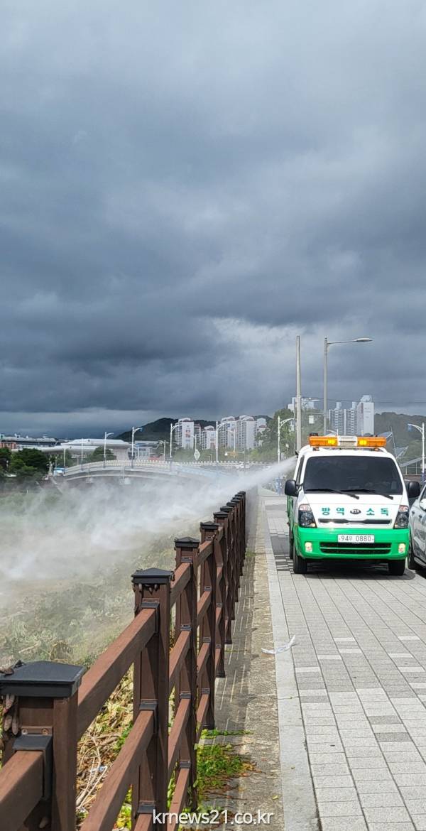 □ 4월부터 주 2회 실시하던 소독을 7월부터는 주 3회로 하천, 수풀 부근 모기유충 서식지를 확인하여 유충구제를 수시로 실시하며, 산책로, 공원, 하천 수풀 등 다중이용시설의 위생해충 방역 요청 시 신속히 방역소독을 실시하여 시민의 불편함을 줄인다는 방침으로 집중 방역에 총력을 기울이고 있다.