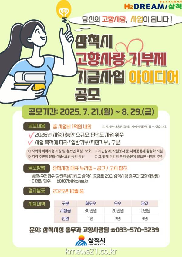 □ 삼척시는 고향사랑기부제의 취지에 부합하는 기금사업을 발굴하고자 7월 21일부터 8월 29일까지 ‘고향사랑기부제 기금사업 아이디어 공모전’을 실시한다.