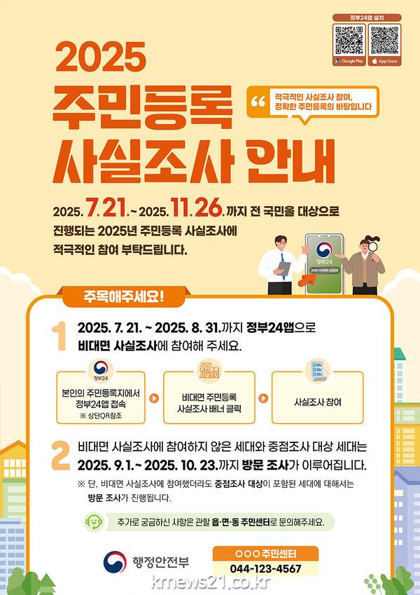 여수시(시장 정기명)는 주민등록의 정확성과 행정 효율성 제고를 위해 7월 21일부터 11월 26일까지 전 시민을 대상으로 ‘2025년 주민등록 사실조사’를 실시한다고 밝혔다.