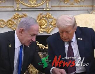 트럼프 미국 대통령과 네타냐후 이스라엘 총리가 정상회담을 마친 뒤 함께 기자회견 단상에 올랐다.