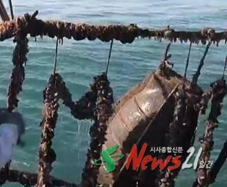홍합을 양식하는 어민들이 부지런히 그물을 끌어올리고 있다.