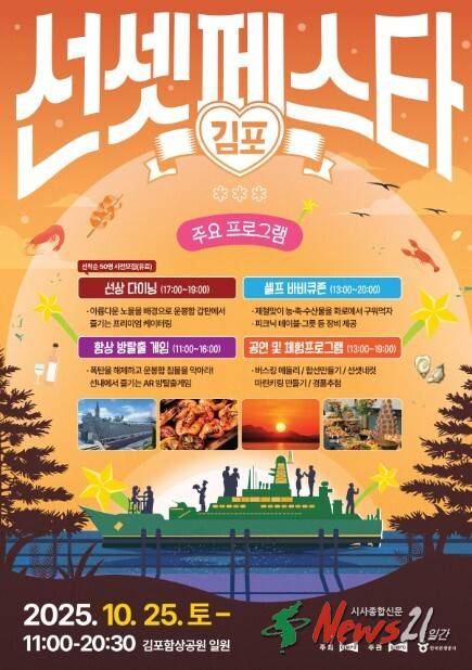 아름다운 석양을 배경으로 선상 다이닝을 즐길 수 있는 특별한 축제가 김포에서 열린다. 오는 25일 단 하루, 토요일 오전 11시부터 밤 8시 30분까지 대곶면 김포함상공원 일원에서 ‘2025 김포 선셋 페스타 with 로컬푸드 다이닝’이 개최된다.
