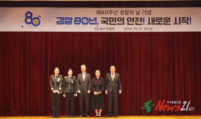 (뉴스21일간/최원영기자)=울산경찰청은 제80주년 경찰의 날을 맞아 ’25. 10. 21.(화) 10:00, 울산경찰청 대강당에서 유윤종 울산경찰청장을 비롯한 울산경찰청 직원들과 김재홍 자치경찰위원장, 협력단체 대표들이 참석한 가운데 제80주년 경찰의 날 기념식을 개최했다.