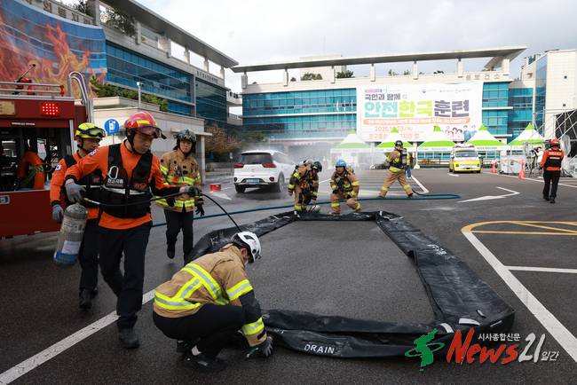 이날 훈련은 15개 기관 및 단체, 300여 명이 참여해, 전기차 화재로 시작한 불이 인근 사회복지시설과 산불로 확산되는 상황을 가정해 열렸다. 지자체와 유관 기관, 민간 단체가 협업해 재난안전대책본부를 운영하여 재난 현장을 신속히 수습해 나가는 과정을 실제처럼 생생하게 훈련하였다.