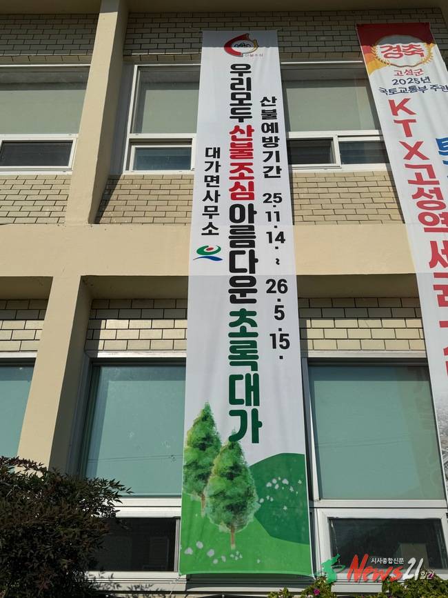 고성군 대가면(면장 노석철)은 겨울철 및 다가오는 봄철 건조기를 대비하여 청사 외벽에 현수막을 게시하여 산불 예방을 홍보하고 있다.