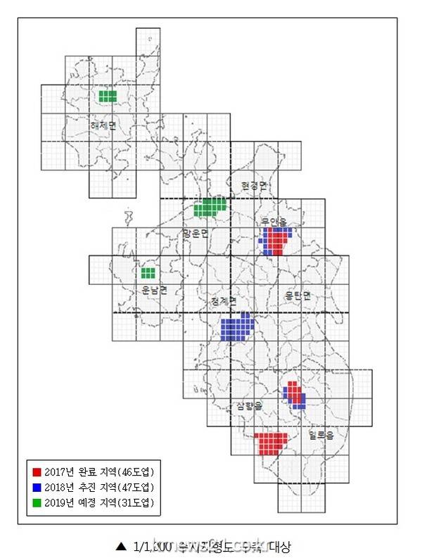 군은 지난해 사업에 이어 올해도 국토지리정보원과 사업비 50:50 매칭사업 협약 체결을 통해 총 3억 5천만 원의 사업비를 투입하여 올 10월 말까지 청계면 도시지역과 무안읍․일로읍 일부 도시지역 9㎢에 대한 수치지형도 제작 사업을 진행하고 있다.