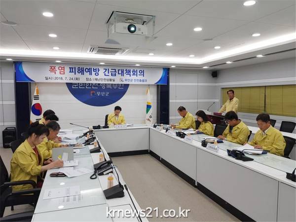(뉴스21/전남)=무안군(군수 김산)은 최근 자연재난 수준의 폭염이 지속되고 있는 가운데 24일 군청 재난상황실에서 폭염 총력 대응을 위한 비상대책 회의를 개최하였다.