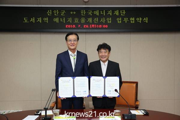 (뉴스21/장병기기자)=신안군과 한국에너지재단은 지난 7월 26일 도서지역 저소득층 에너지 복지향상을 위한 에너지효율개선사업 도서지역 집중지원 업무협약을 체결하였다.