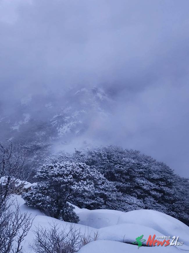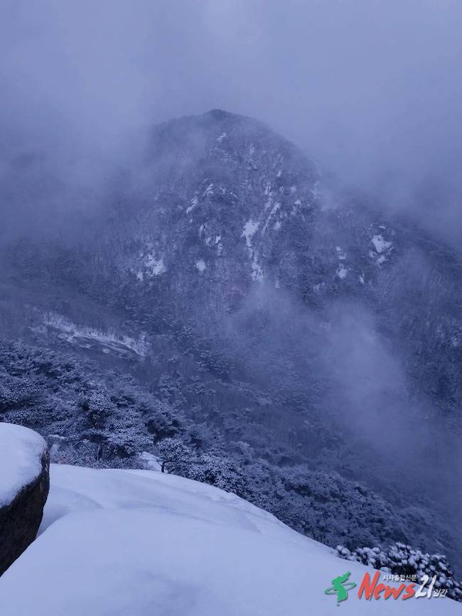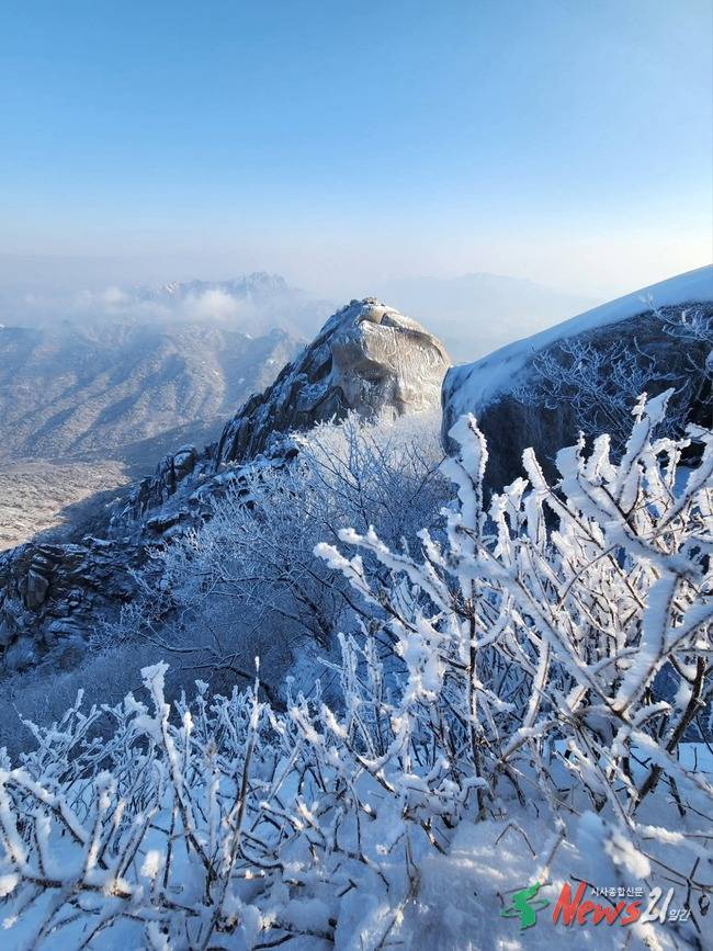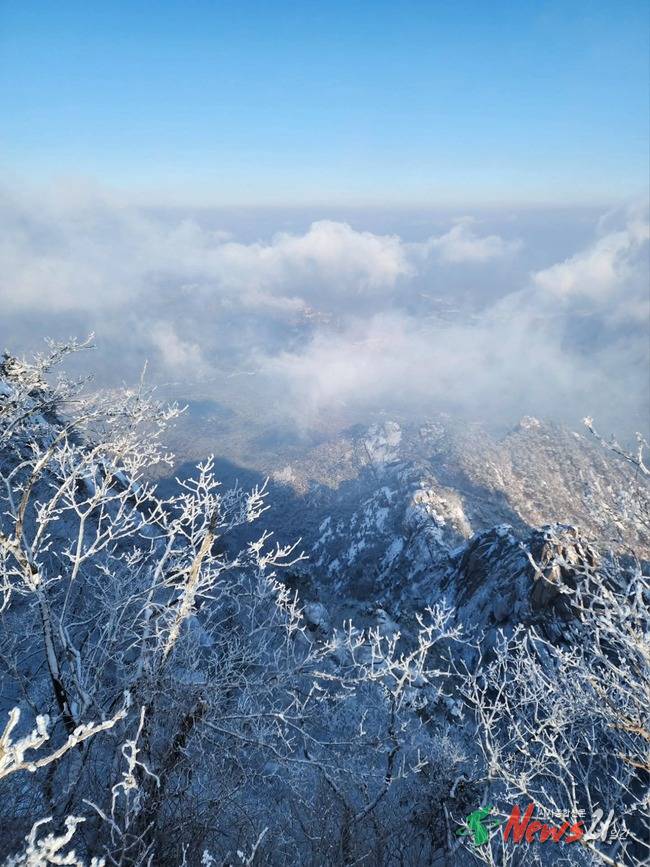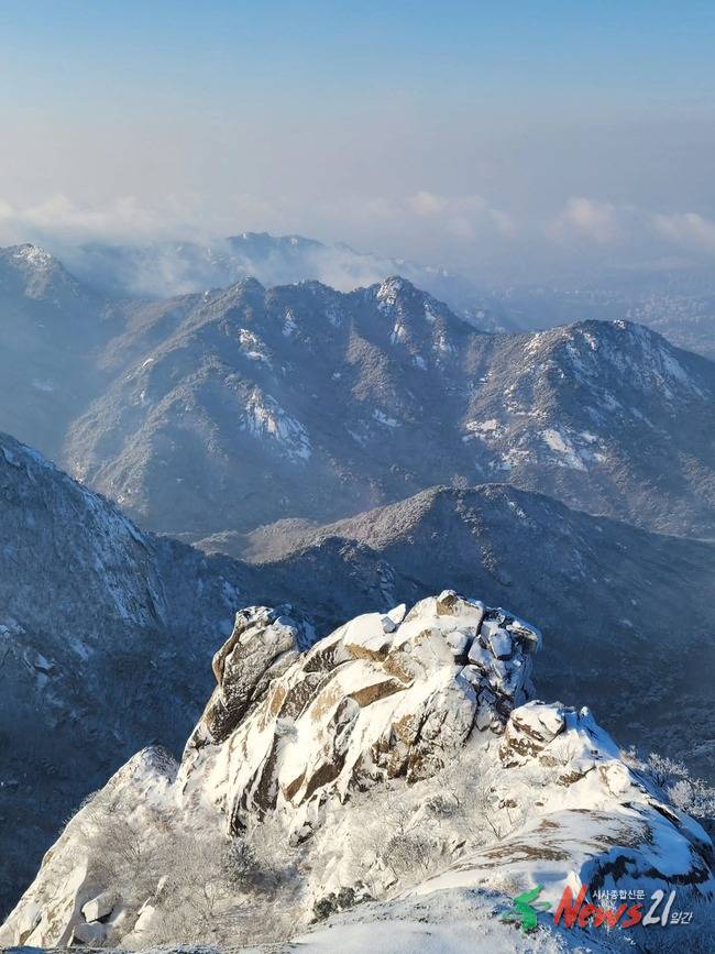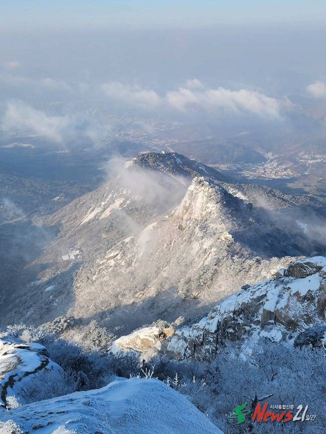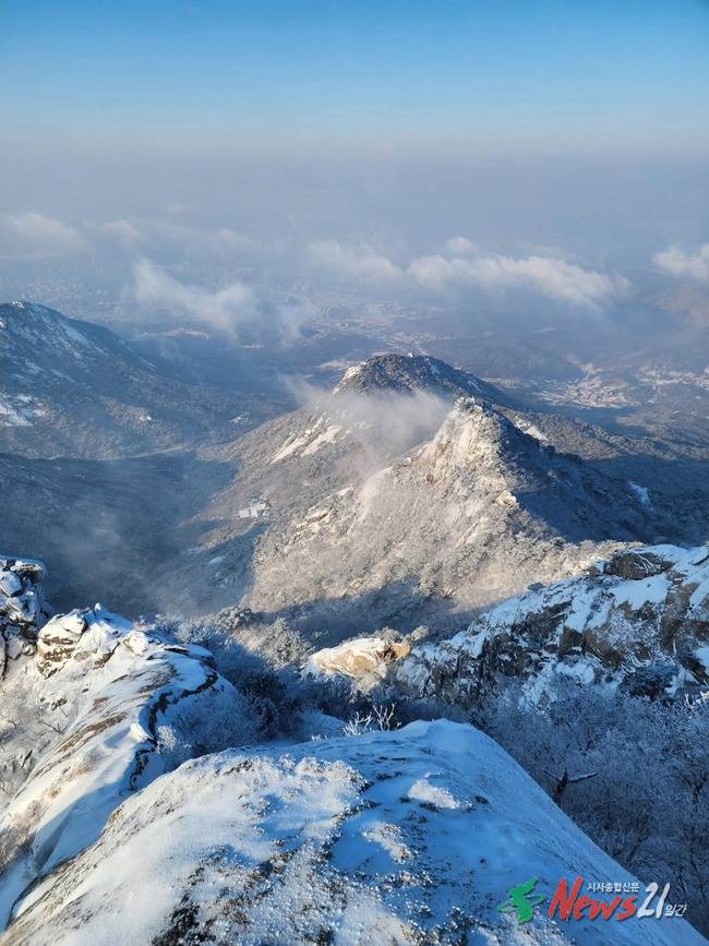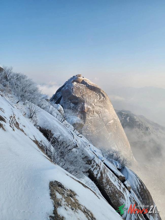 백운대는 서울과 경기 경계에 위치한 북한산의 최고봉으로 높이는 약 836m다.