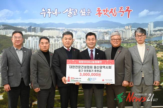 (뉴스21일간/노유림기자)=대한전문건설협회 울산광역시회(회장 조현철)가 12월 19일 오후 2시 중구청 구청장실을 찾아 울산사회복지공동모금회를 통해 이웃돕기 후원금 300만 원을 전달했다. 이번 전달식에는 김영길 중구청장과 조현철 대한전문건설협회 울산광역시회 회장, 박영민 대한전문건설협회 울산광역시회 수석부회장 등 7명이 참석...